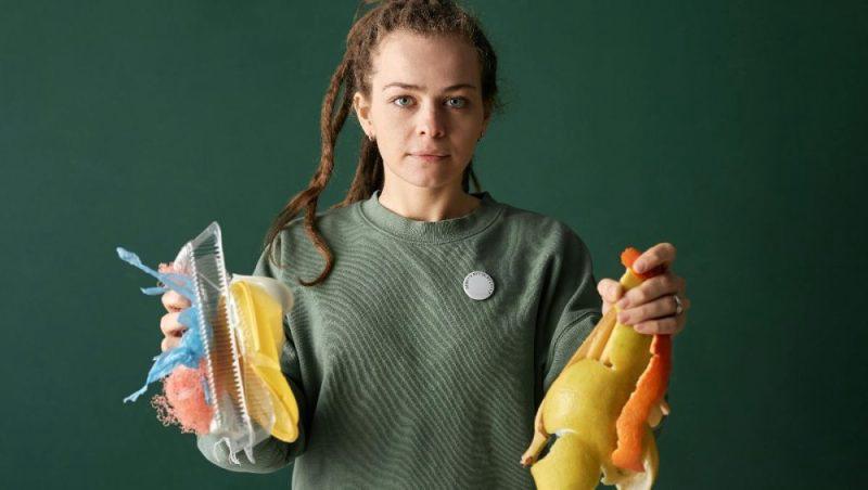 A girl holding plastic and fruit peel wastes.